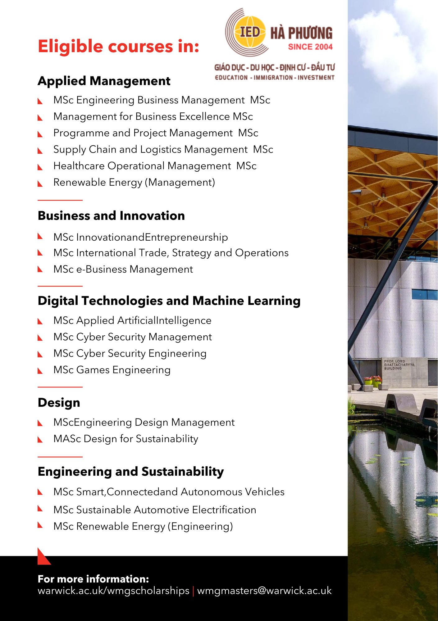 Với kinh nghiệm nhiều năm trong lĩnh vực tư vấn du học, Hà Phương IED tự hào là cầu nối giúp sinh viên Việt Nam tiếp cận trực tiếp các chương trình học bổng chính thức từ University of Warwick – WMG.